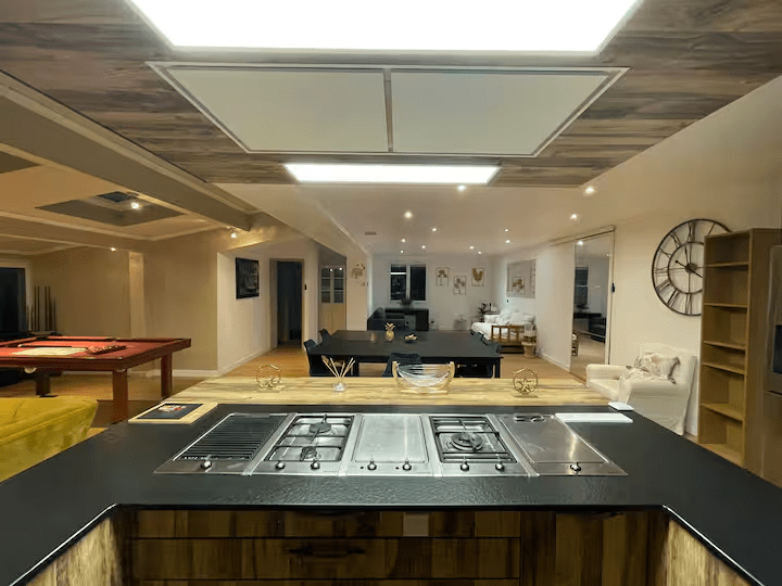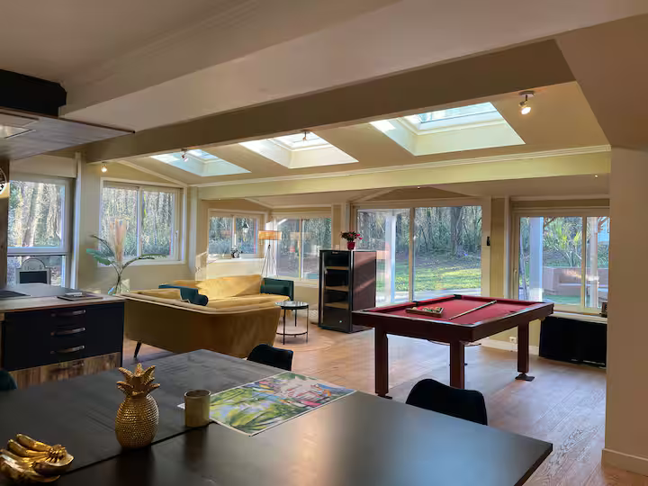 Une grande pièce de vie de 90 m² avec salon, salle à manger, billard et TV.